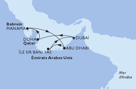 (1) MSC Euribia : Prix par personne, à partir de, hébergement base cabine double intérieure ambiance "Bella", les frais de service hôtelier, croisière de 8 jours/7 nuits au départ de Dubaï, départs le 13 décembre 2025.