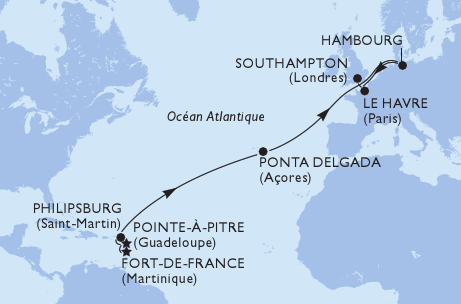 (1) MSC Virtuosa : Prix à partir de, par personne, vol aller offert de Paris vers Pointe-à-Pitre, transfert aller de l'aéroport de Pointe-à-Pitre au port, croisière de 15 jours / 14 nuits de Pointe-à-Pitre vers Le Havre, base cabine double intérieure ambiance "Bella", pour un départ de Pointe-à-Pitre le 5 avril 2026.