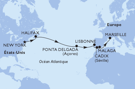 (3) MSC Meraviglia : Prix à partir de, par personne, vol aller de Paris vers New York inclus, une nuit à l'hôtel, transfert aller de l'aéroport de New York à l'hôtel puis de l'hôtel au port, croisière de 16 jours / 15 nuits de New York vers Marseille, base cabine double intérieure ambiance "Bella", pour un départ de New York le 19 avril 2026.